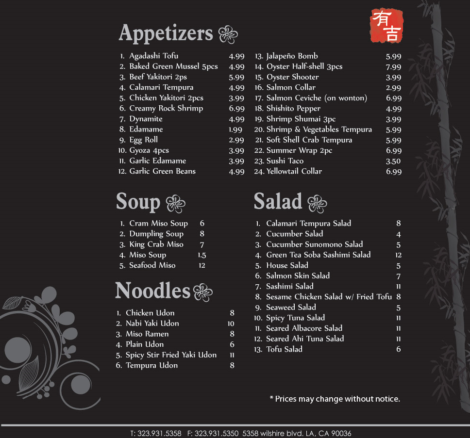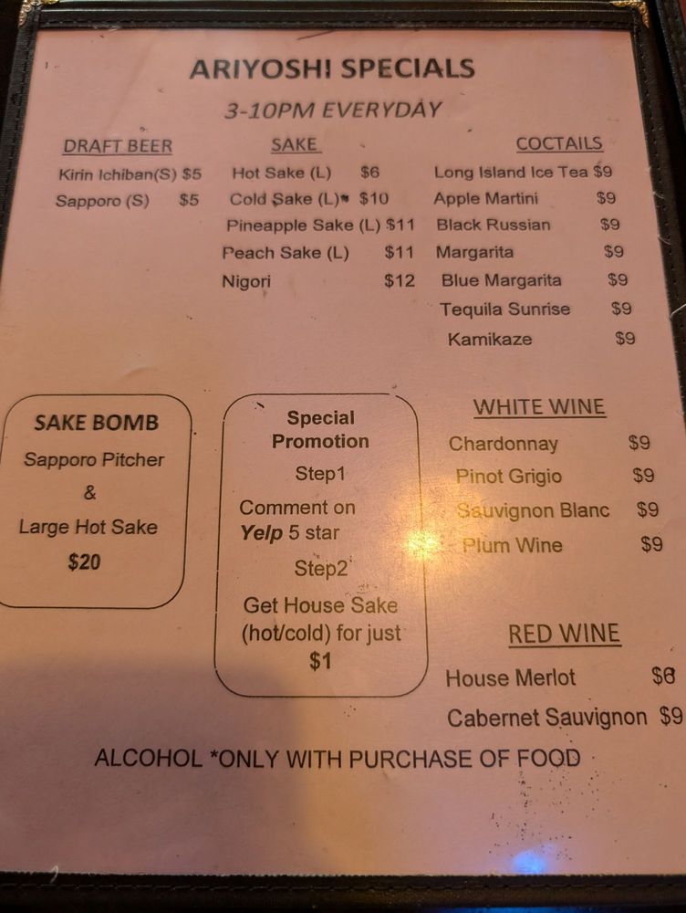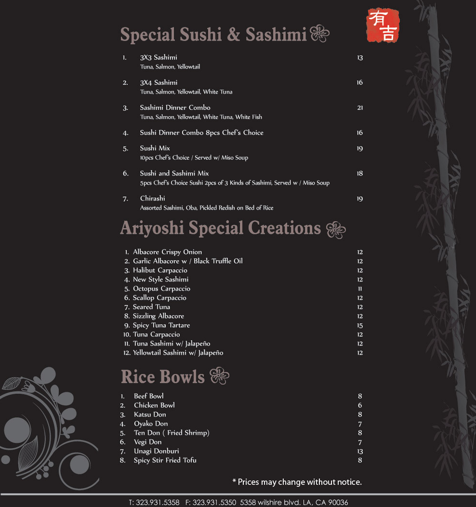 Welcome to Ariyoshi Sushi Cafe Izakaya, a hidden gem nestled in Los Angeles' vibrant culinary scene. This Asian fusion eatery offers a delightful array of authentic Japanese dishes, catering to both sushi enthusiasts and those seeking vegetarian options. Beyond the classics like the California Roll and delicious Albacore Sashimi, Ariyoshi presents unique creations, including their renowned Chef's Choice Sushi, ensuring something for every palate.